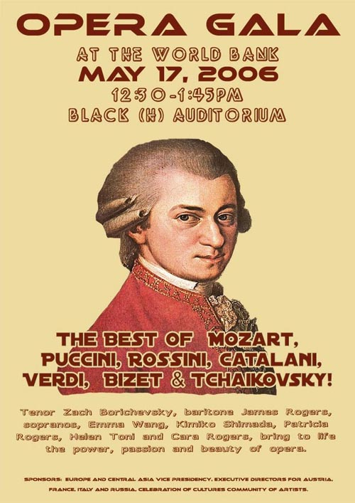 Ligia and I attended the World Bank’s first Opera Gala today. The singers who participated in the program were an eclectic mix: previous and existing bank employees, students enrolled in opera programs at local universities, and professionals. The Gala Program and the Artist Bios can be accessed by clicking on each of their respective links.