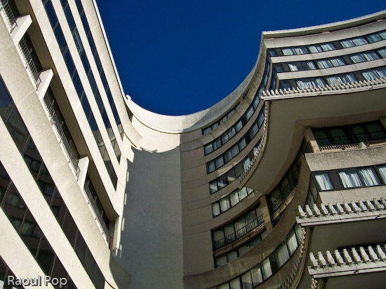 The inside courtyard of the Watergate Hotel in Washington, DC is shown below. The camera always managed to expose photos decently when confronted with situations like this: a wall in shade and the bright sky above. A LOT of cameras have problem with this kind of a setup, including my 5D, which tends to overexpose the sky.