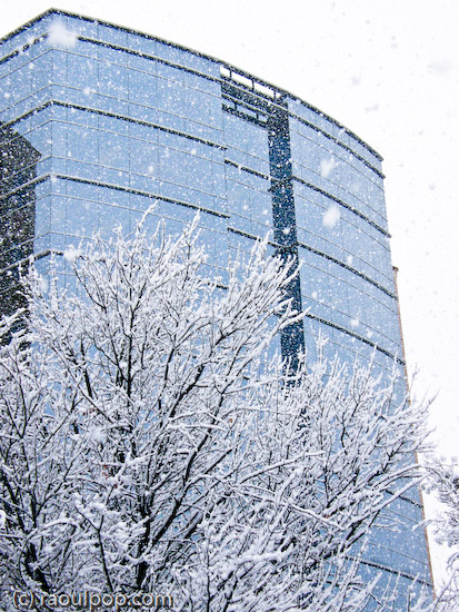 Glass building in snowstorm