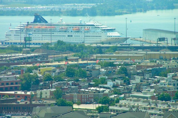 From the top of the WTC, you can see the working side of the Baltimore port as well. There was a large cruise ship anchored far off, and a few freighters were either getting loaded or unloaded as well.