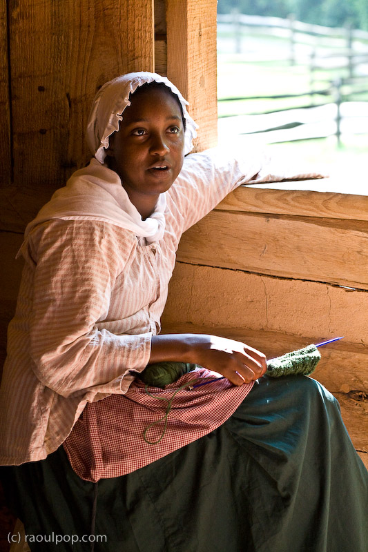 An employee at Mount Vernon dressed in period garb tells visitors what life was like for the slaves.