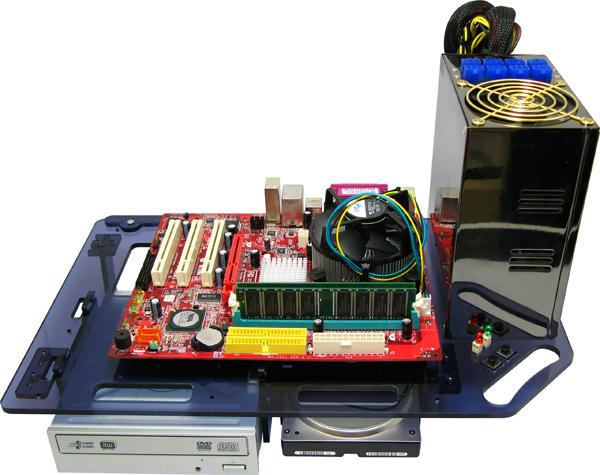This is a precision-drilled acrylic board, onto which you can install the usual components that go inside a computer, such as a motherboard, video card, power supply, CD-ROM and hard drive. The kick is that everything’s out in the open so it can be easily serviced. Nice concept, but somewhat pricy at $76 bucks, no?