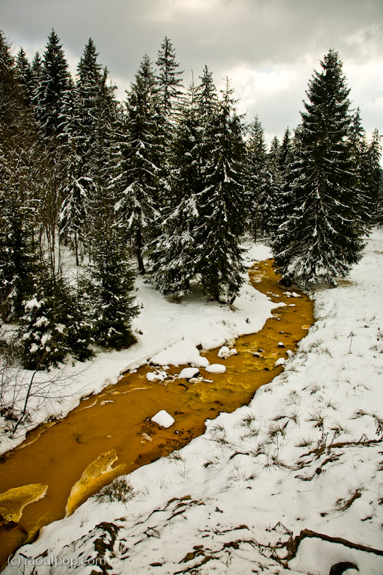A brook rich in iron ore flows through a meadow still covered by snow, high up in the Carpathian Mountains in Transilvania, Romania.