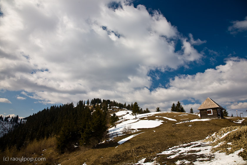 A small cabin sits on the top of a peak in the Carpathian Mountains, Romania.