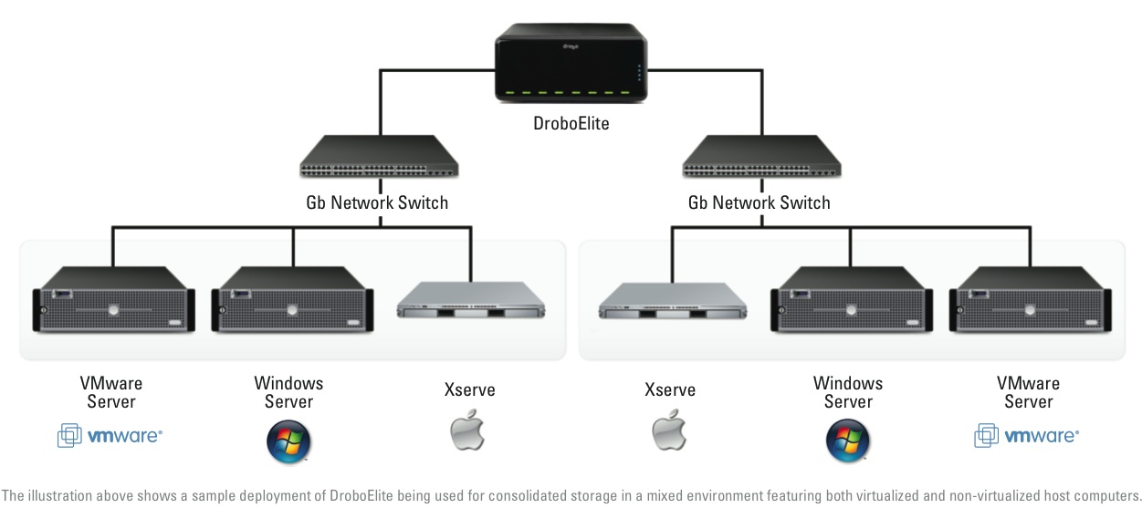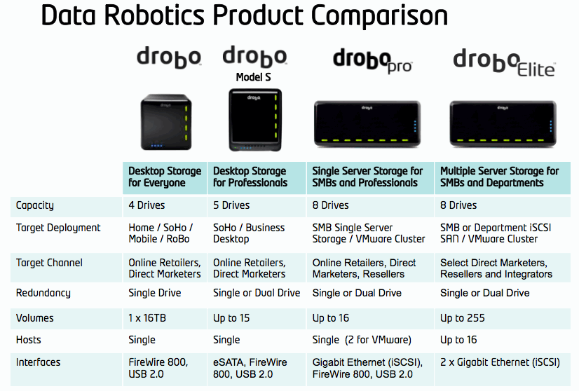 - Multi-host connectivity: whereas the DroboPro could only be connected to a single host (two if using VMware), the DroboElite can connect to 16 different hosts.