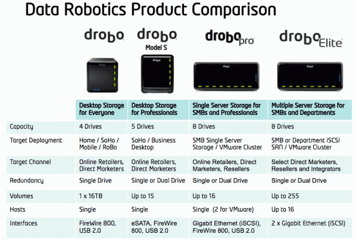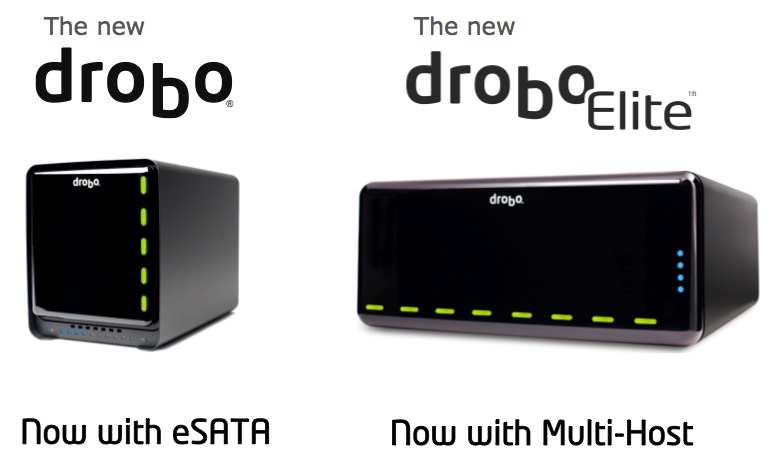 Data Robotics launched the original Drobo in mid-2007, then upgraded that to what we call the Firewire Drobo toward the end of 2008, introduced the DroboPro in April 2009, and now they’re launching the DroboElite, which you can see here, and the Drobo S, addressed in a separate post, also published today.