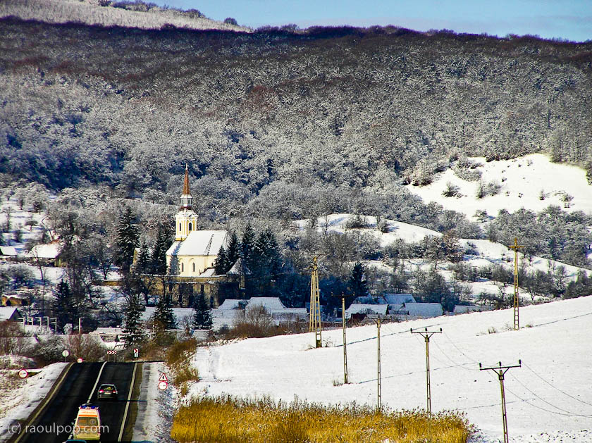 The road approaches a village in Southern Transilvania, Romania near Mesendorf. A large, fortified church is clearly visible in the foreground. A winter landscape.