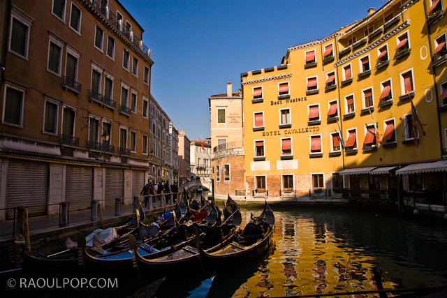 Gondolas docked next to Hotel Cavalletto, Venice, Italy.