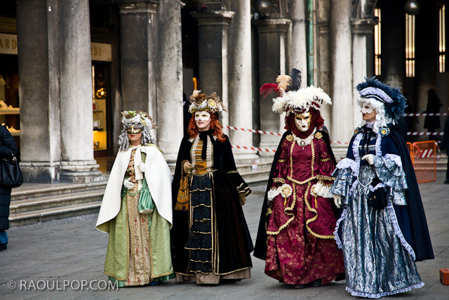 Tourists and people wearing masks and period costumes, in Piazza San Marco, Venice, Italy for the yearly Carnival.