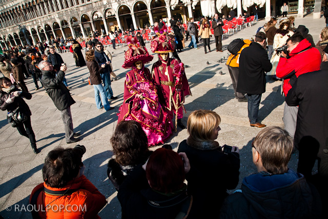 Tourists and people wearing masks and period costumes, in Piazza San Marco, Venice, Italy for the yearly Carnival.