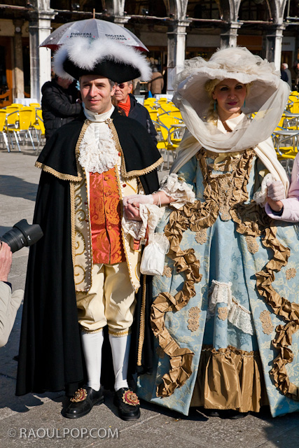 Tourists and people wearing masks and period costumes, in Piazza San Marco, Venice, Italy for the yearly Carnival.