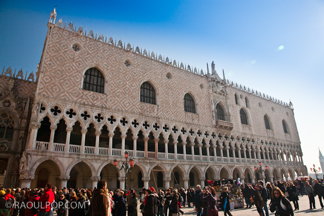 Tourists and people wearing masks and period costumes, in Palazzo Ducale, Piazza San Marco, Venice, Italy for the yearly Carnival.