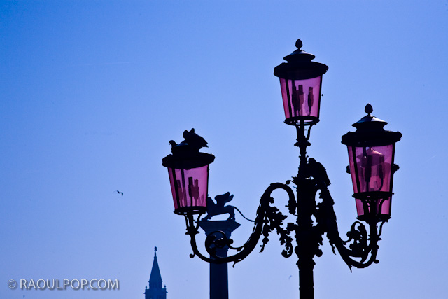 Elaborate streetlights made of wrought iron and mauve tinted glass, Piazza di San Marco, Venice, Italy.