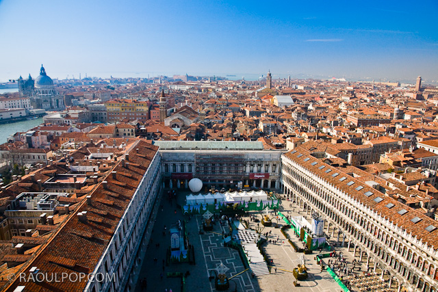 A panoramic view of the Piazza di San Marco and the city of Venice, Italy, from the Campanile of the same piazza.
