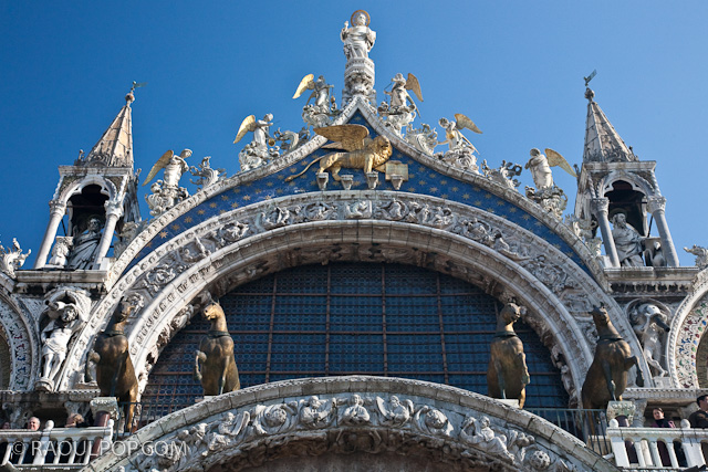 Main cupola above the entrance to the Basilica di San Marco, Venice, Italy, featurig the golden lion and the golden horses.
