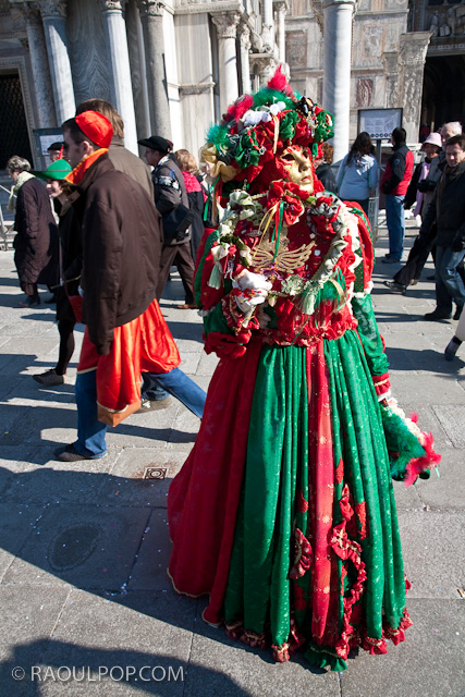 A participant in the yearly Venice Carnival, dressed in a red and green costume, in front of the Basilica di San Marco, Venice, Italy.