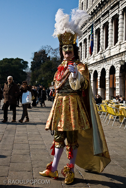 Participants in the yearly Venice Carnival, walking in the Riva degli Schiavoni, in front of the Museo Archeologico, Venice, Italy.