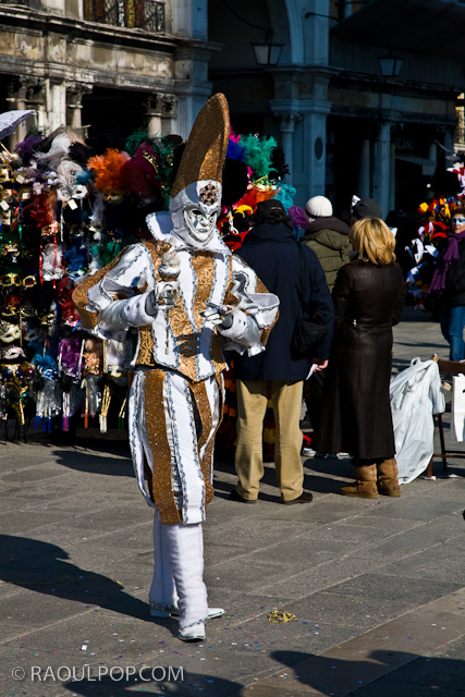 Participants in the yearly Venice Carnival, standing in the Piazza di San Marco, Venice, Italy.