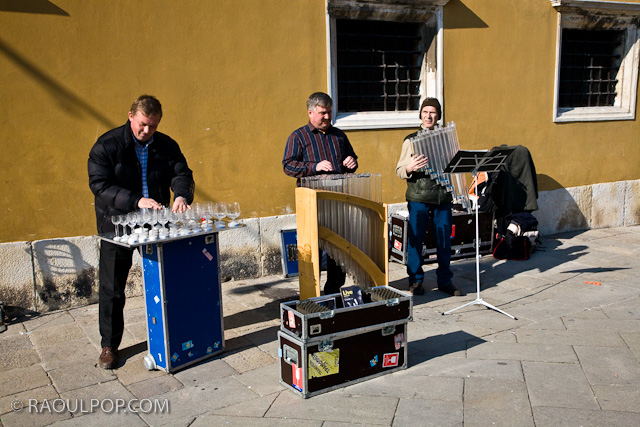 The Crystal Trio giving a street performance in a piazza in Venice, Italy.