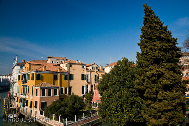 Buildings near a bridge over the grand canal in Venice, Italy.