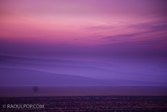 Fog rolls over the distant hilltops while darkness falls over the land. The sky is painted pink and orange with the last remnants of sunlight. A small tree stands alone in the foreground.