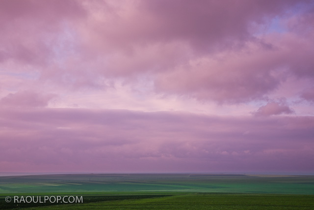 Cloudy sky tinged with pink and purple, over a wide, green field.
