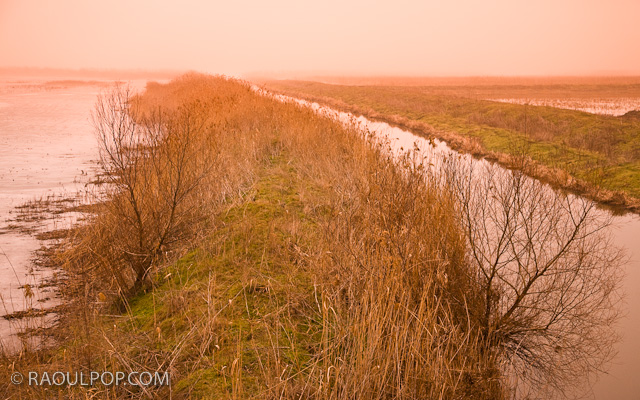 Foggy morning, somewhere in Dobrogea. This is a barrier that separates a natural lake/pond in two halves, leaving way for a canal. The canal flows into another pond, pictured somewhere else in this album.