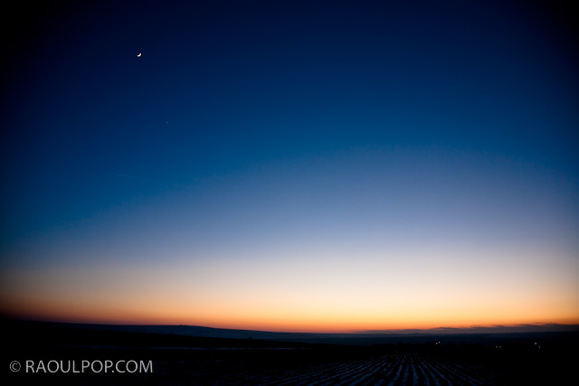 The sun has gone below the horizon, the semilune is up, and the field would be eerily quiet but for the howling wind. Photo taken somewhere near Cogealac, in the province of Dobrogea, Romania.