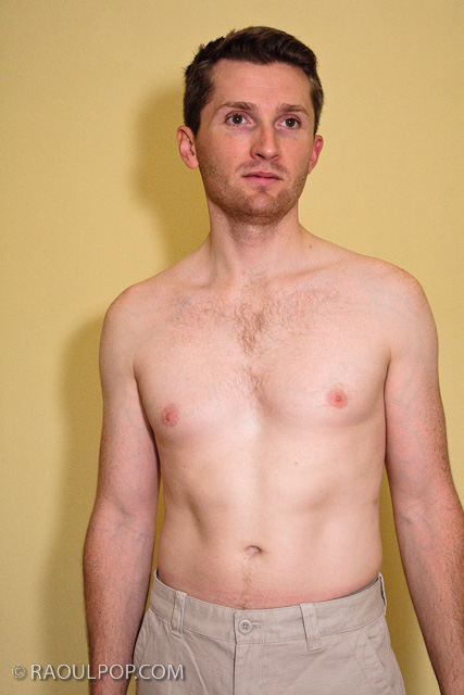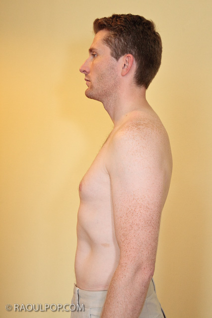 This photo of my side shows what happens when you sit in front of the computer all day. My posture is screwed up. You can see my neck craning forward from all that squinting at the monitor. You can clearly see the lack of muscle tone in my pecs and my abs… and I could on and on about what’s wrong here.