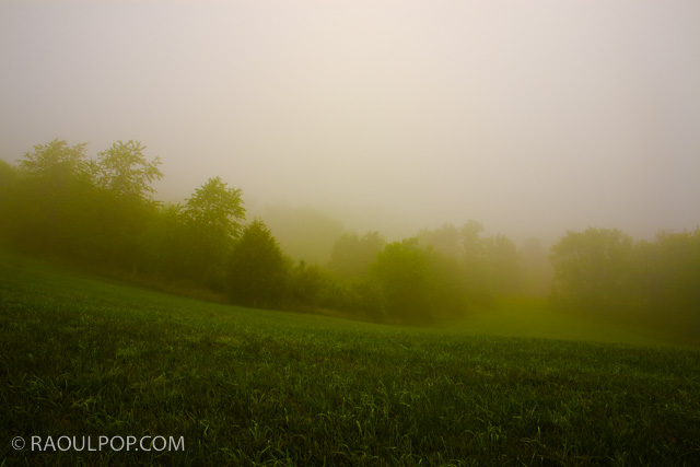 A foggy morning in the Virginia countryside, in an open meadow outside an evergreen forest. Near Natural Bridge, VA, USA.