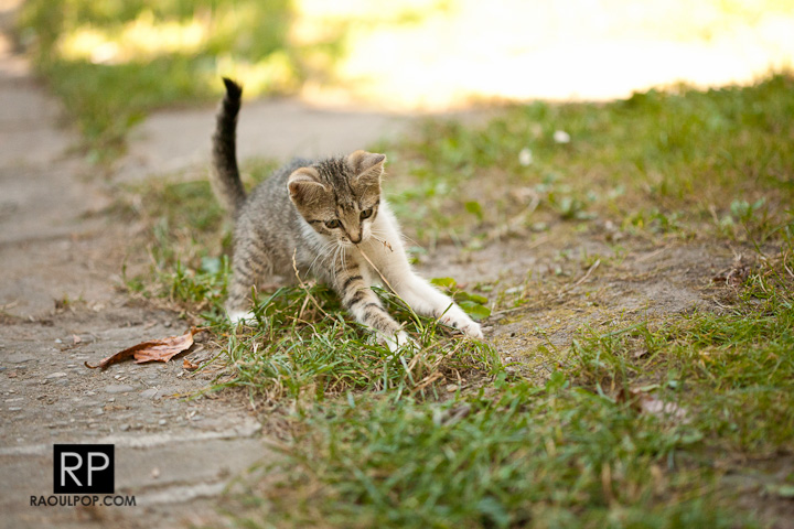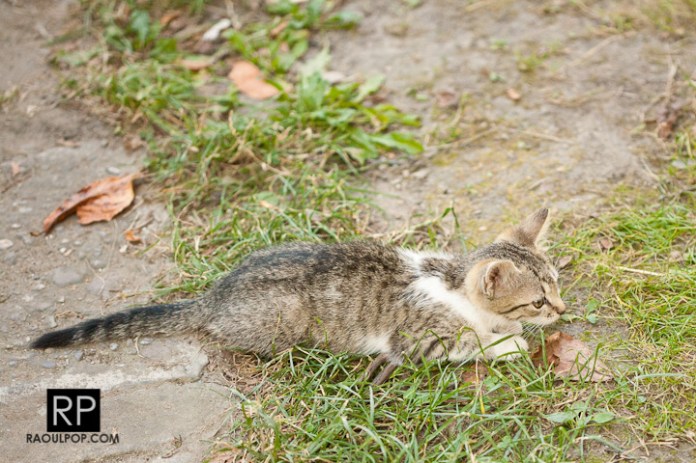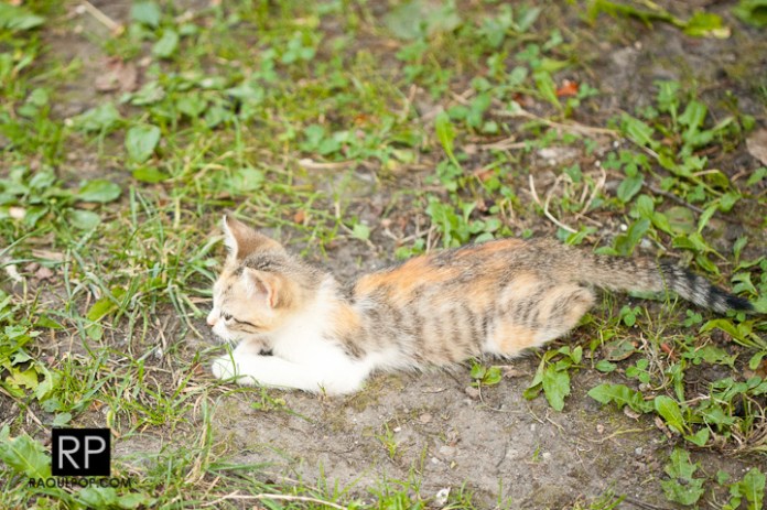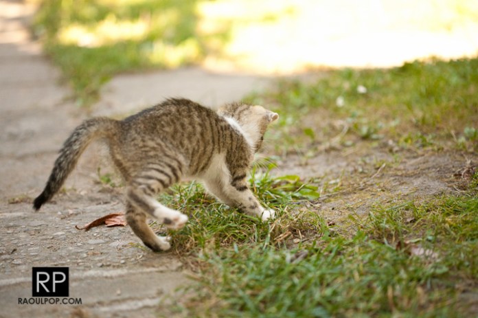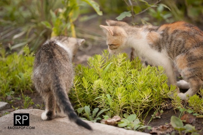 Kittens love these hit-and-run encounters. They’d pounce, tumble about for a bit, and dash away. Here Mitzi jumped away from Trixie after she ambushed her, then hid between the bushes while Trixie began to play by herself.