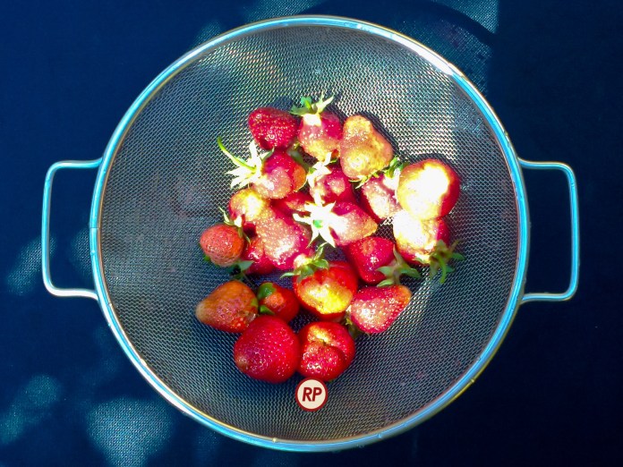 At this morning’s breakfast, we had fresh strawberries from our garden. It was the first ripe batch this season, picked just minutes before we ate them. No artificial ripeners or chemicals used in our garden, I can tell you that!