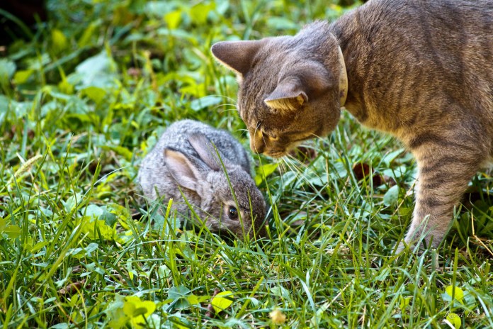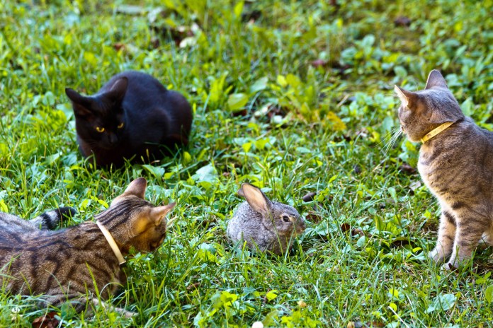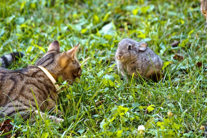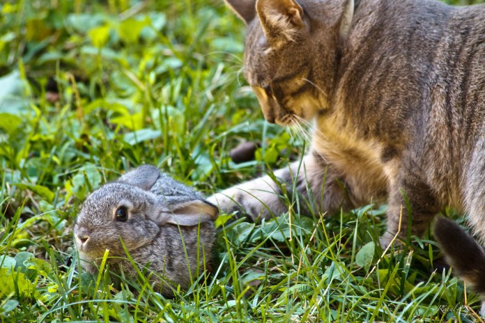 Fritz stood there in the grass, small as he could make himself, probably thinking he’d get gobbled up, but our kittens are those kinds of cats. They’re nice and friendly. They do tend to get a little mischievous at times, but they didn’t want to hurt Fritz.