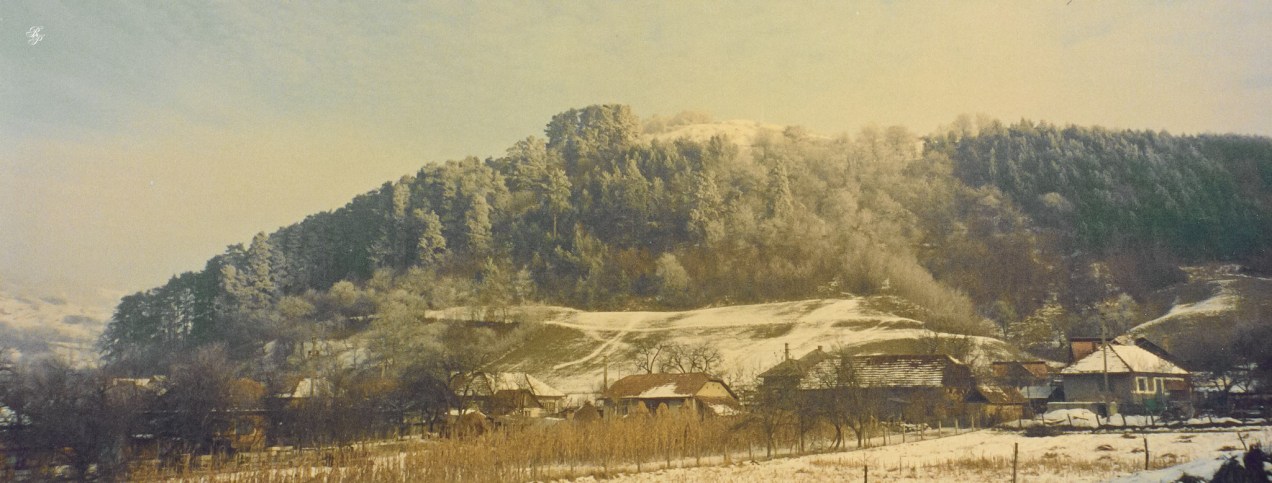 APS film, winter of 1998. A sleepy village nestled at the base of a hill covered with snow-laden evergreens.