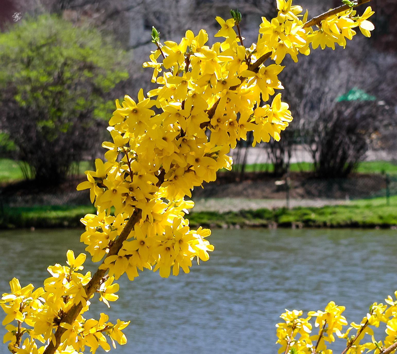 Golden bell blossoms on the shore of a lake, Grosvenor, North Bethesda, MD, USA.