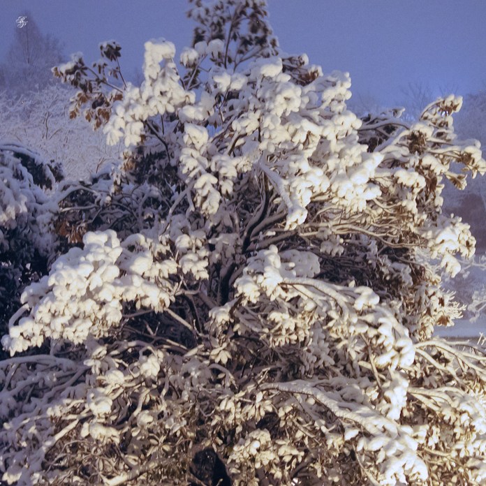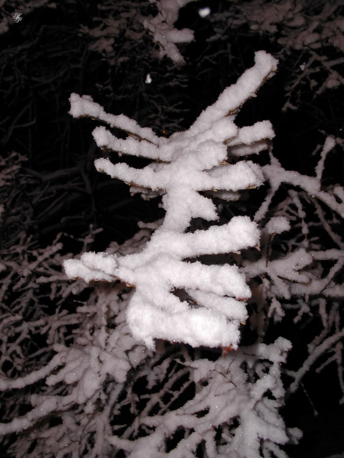 The snowfall in question here started in the evening, with thick, fluffy flakes that started to fall down faster and faster, piling on all trees, as you see above and below.