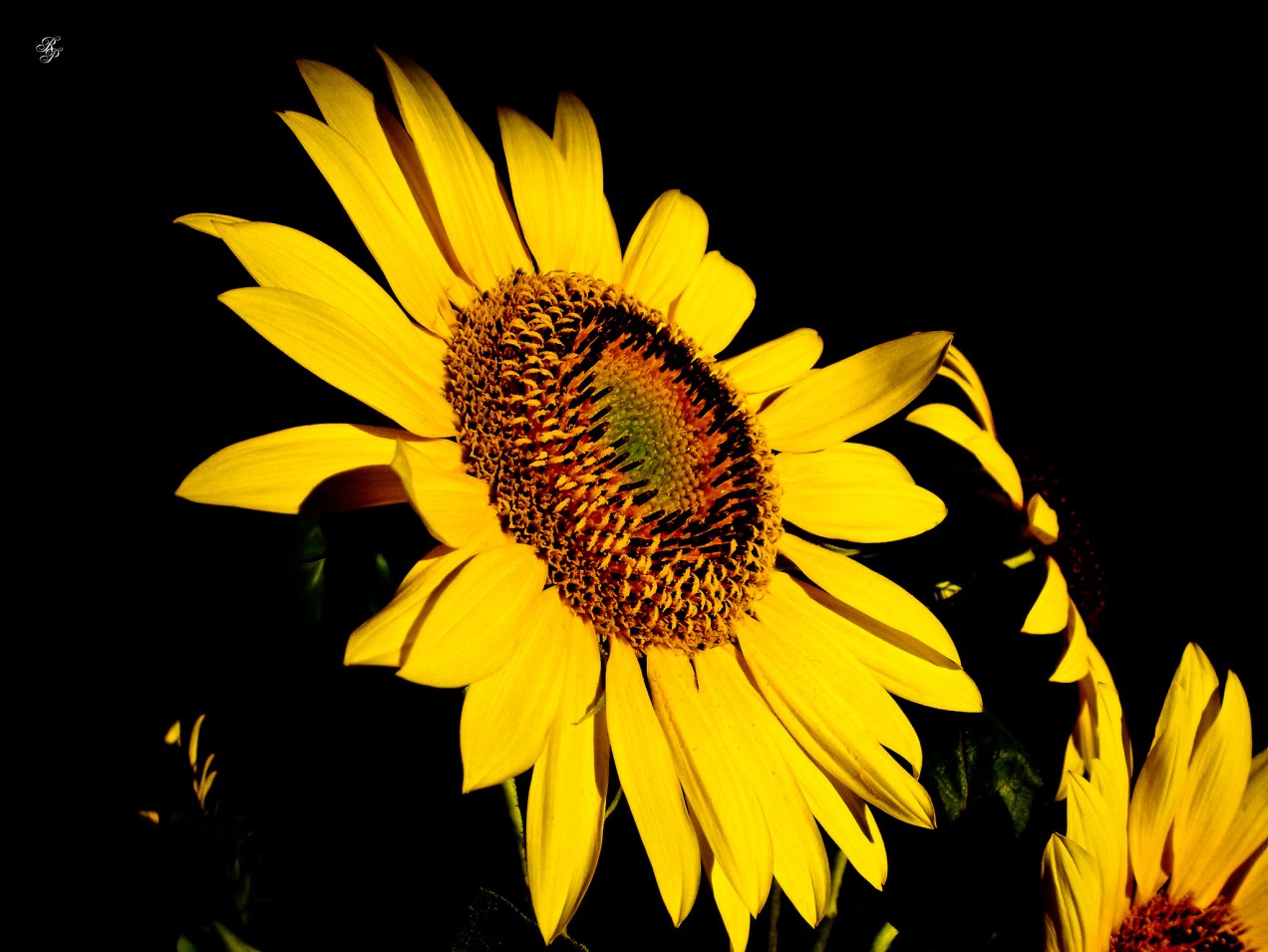 Still life, bright, golden-hued sunflowers in a glass vase. Grosvenor, North Bethesda, MD, USA.