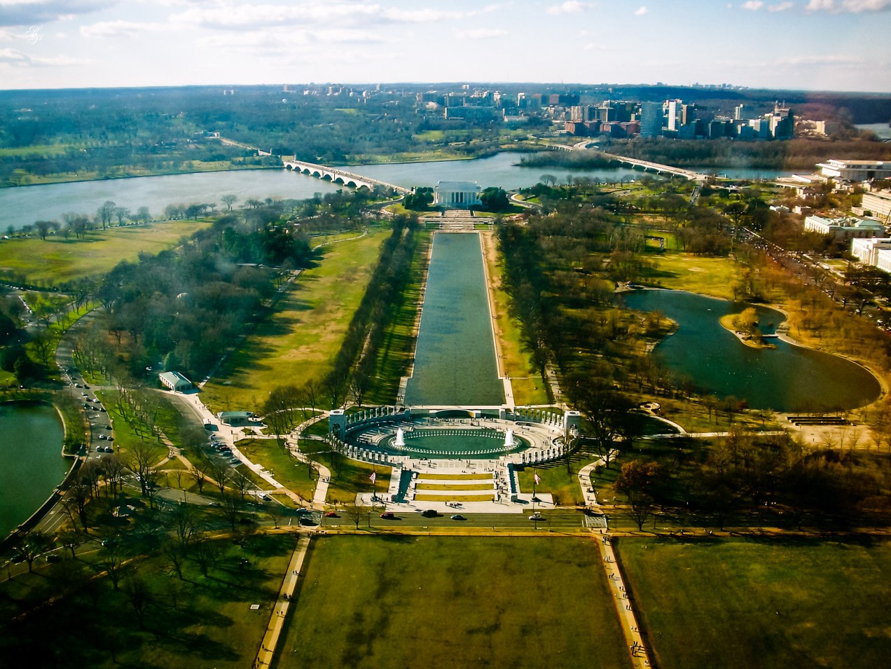 A panoramic view of the World War II Memorial, in Washington, DC. The Reflecting Pond connects the Memorial with the Lincoln Monument, followed by a bridge over the Potomac River behind that.