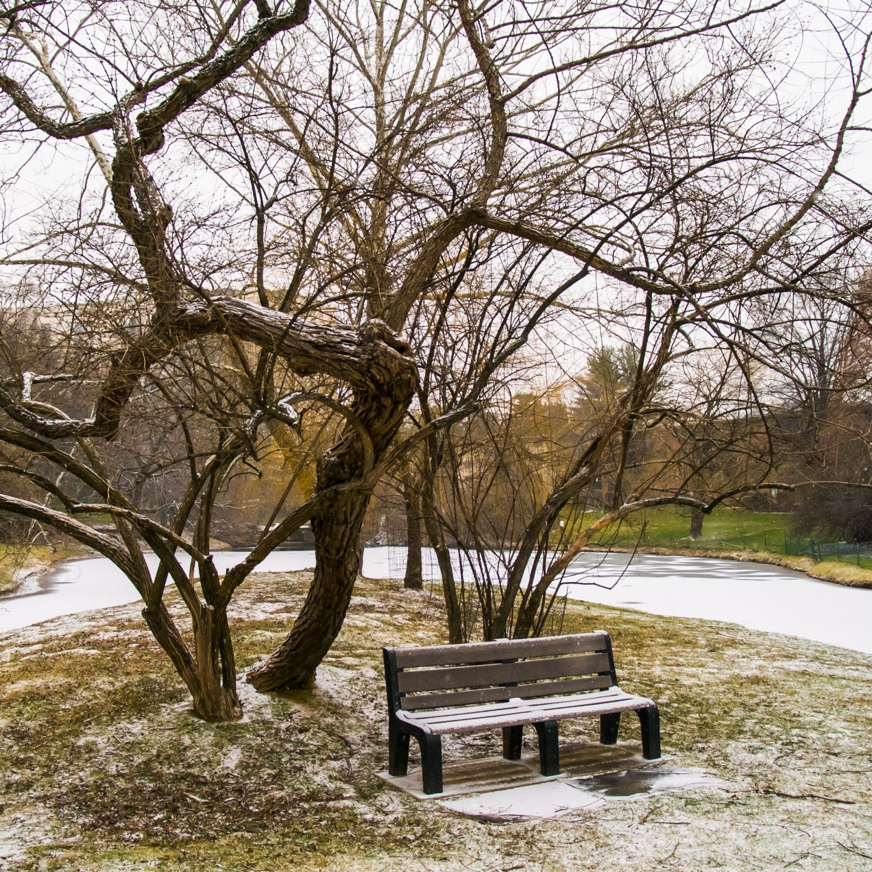 Bench and trees on island in middle of lake. Grosvenor Park, North Bethesda, MD, USA.