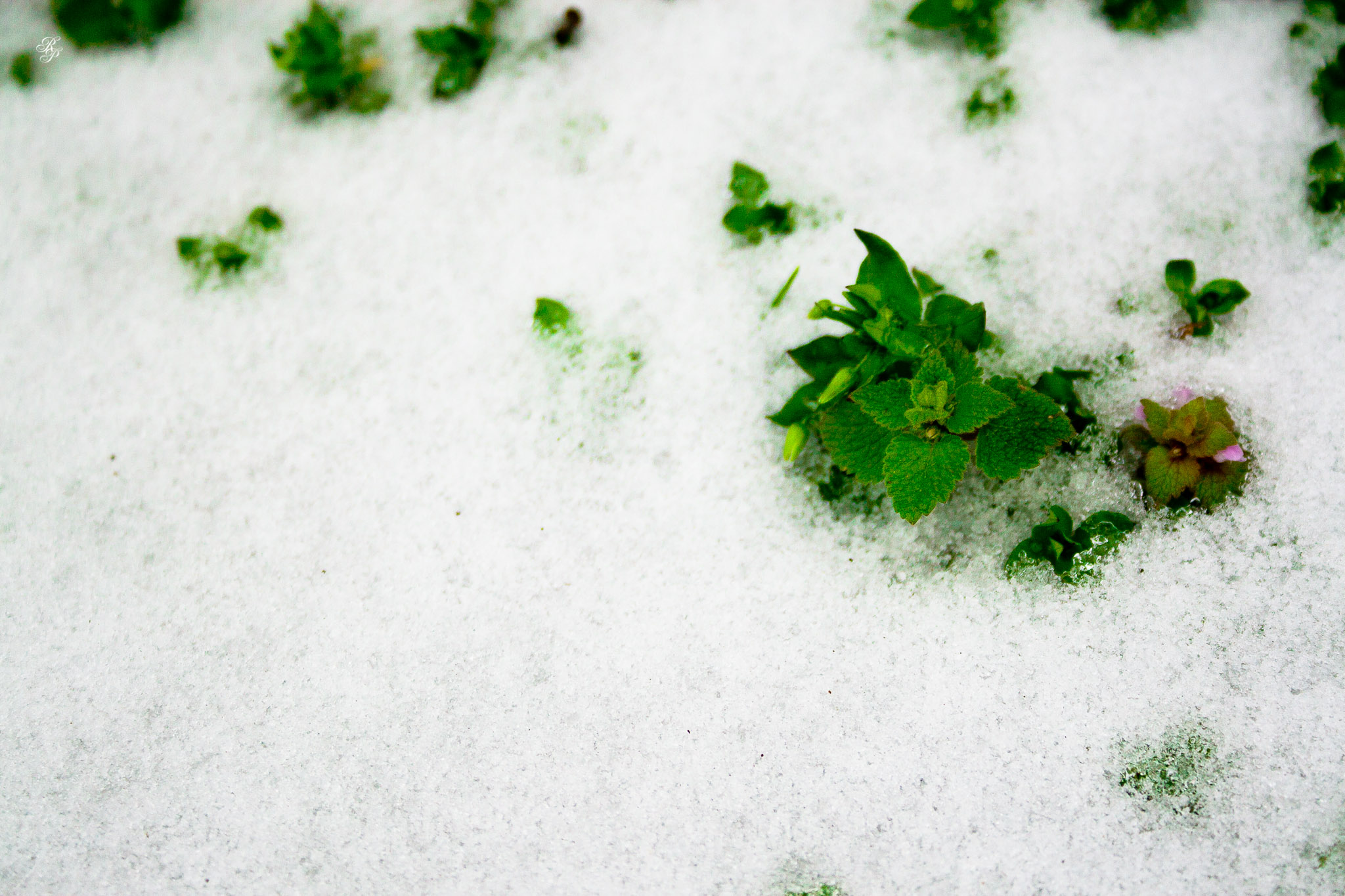 Mint buried in snow, National Arboretum, Washington, DC, USA.