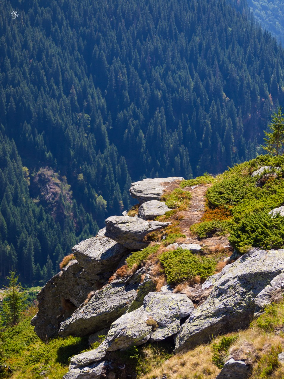 A stone terrace overlooking the Southern Carpathians from the Transfagarasan Road, Romania.