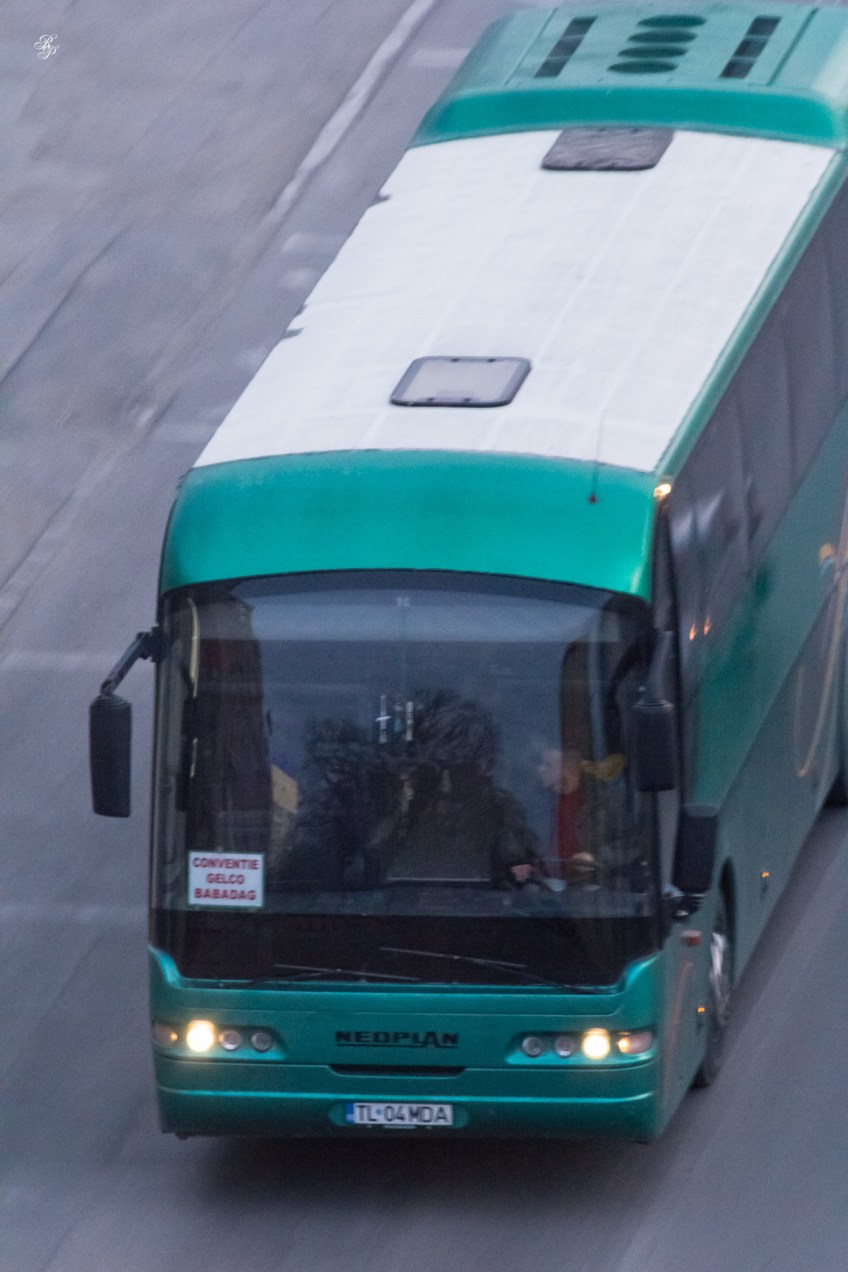 A green bus, early morning, Tulcea.