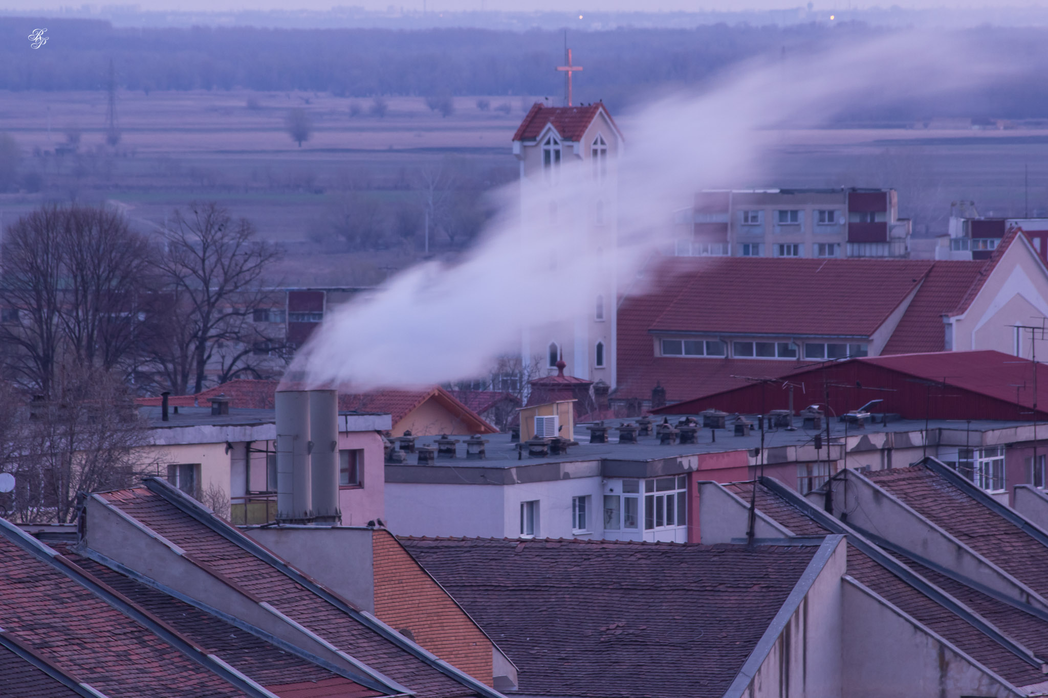 A plume of smoke rising from rooftops, early morning, Tulcea.