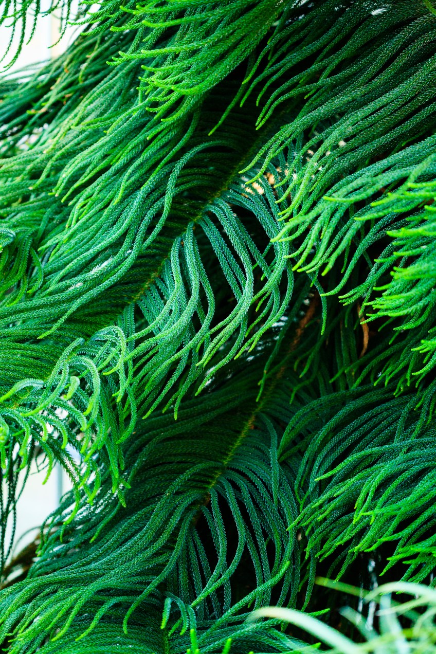 Softly billowing evergreen branches, resembling either long hair or marine algae.