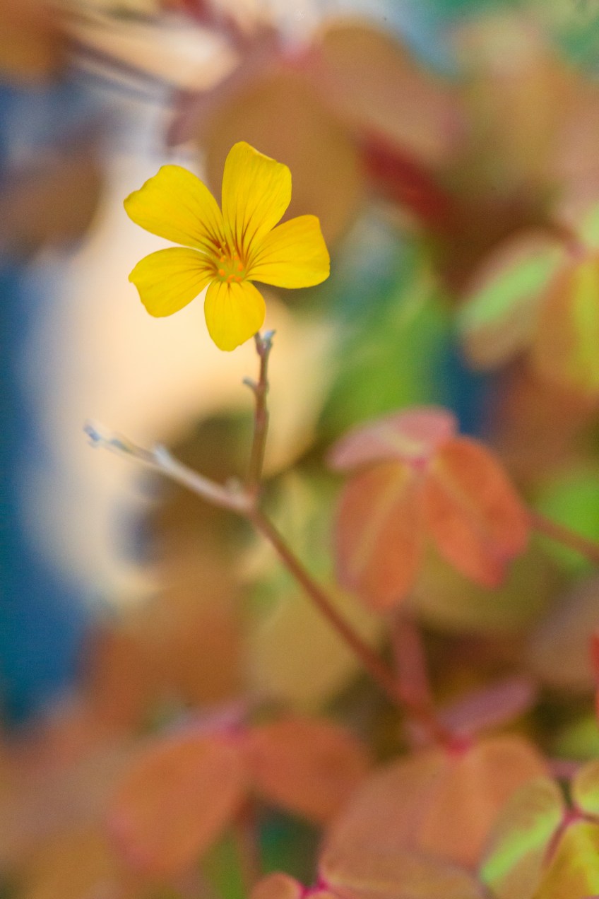 A small yellow flower, growing out of a thin stem in the underbrush.