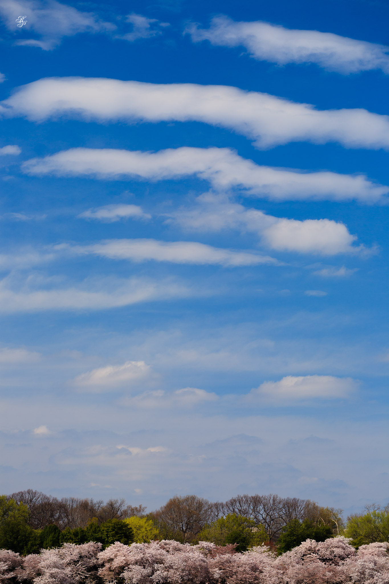 Layers of fluffy clouds float above the blooming trees. Taken in Washington, DC, USA, during the 2008 Cherry Blossom Festival.