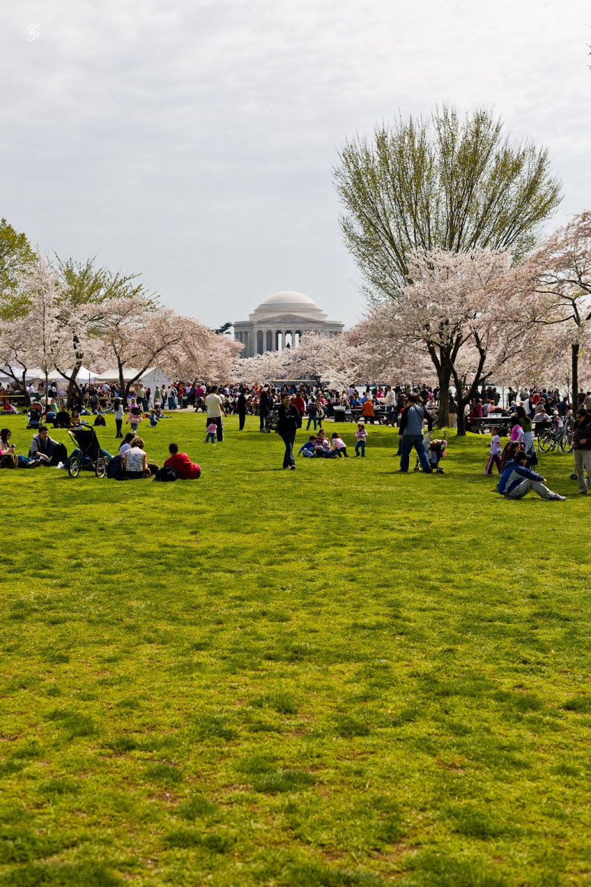 People rest on the lawn in front of the Thomas Jefferson Memorial. Taken in Washington, DC, USA, during the 2008 Cherry Blossom Festival.