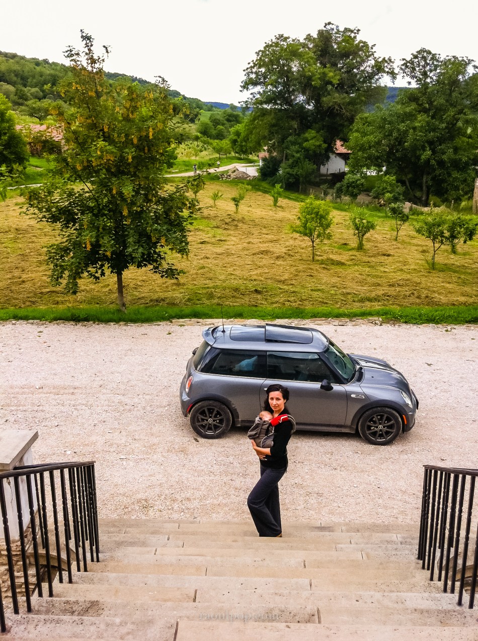 Ligia and Sophie standing on the staircase of the main entrance at the Mălâncrav Domain, Sibiu, Romania.