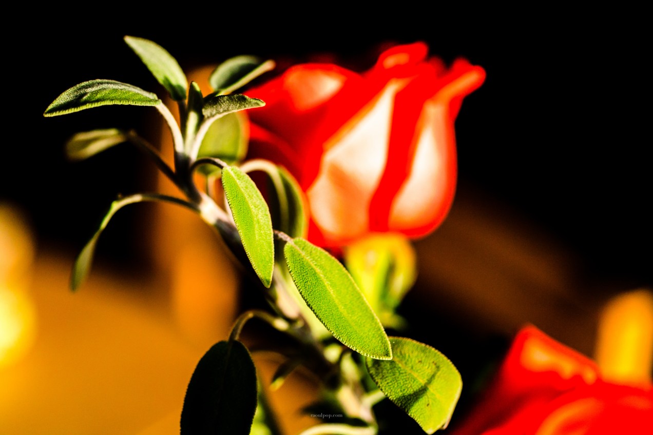 Muted greens and reds in this still life of roses and a plant with soft leaves.