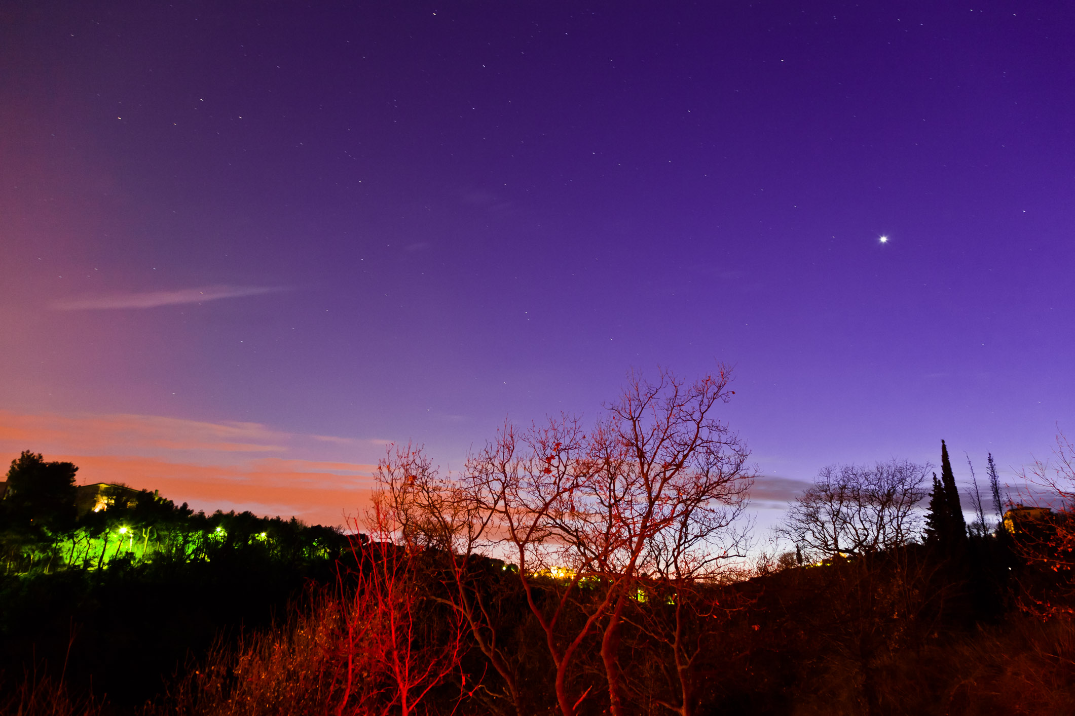 Outside Grottammare, Italy, at night. Can you guess why the branches in the foreground are colored red?